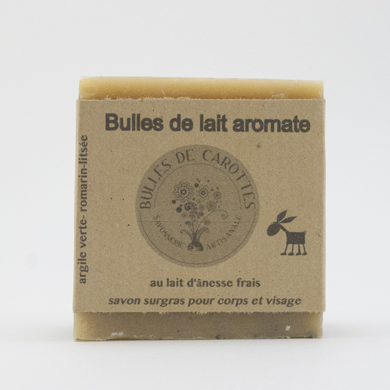 Le Lait aromate : Beurre de karité*, huile d’olive*, beurre de coprah* saponifié, lait d’ânesse frais* (12%), huile de colza*, huile de tournesol*, eau, glycérine°, huiles essentielles de litsée* et de romarin*, argile verte.